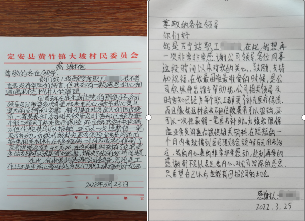 2022年初,两封特殊的感谢信被递交到海南交控工作人员手中。基层管理站两名职工不幸确诊癌症,面对庞大的医疗费用一筹莫展之际,公司领导和同事多次看望,鼓励其战胜疾病,由于公司为职工购买了补充医疗保险,在相关工作人员的积极协助办理下,两位职工均在较短时间内获得了45万元的保险理赔金和3万余元的医疗费用报销,真正解决了他们的燃眉之急、后顾之忧,增强了他们战胜病魔,早日康复回归团队并肩作战的信心和决心。他们在感谢信中说:“由衷的感谢公司,无论是工作上还是生活上都处处为职工谋福利计长远。”