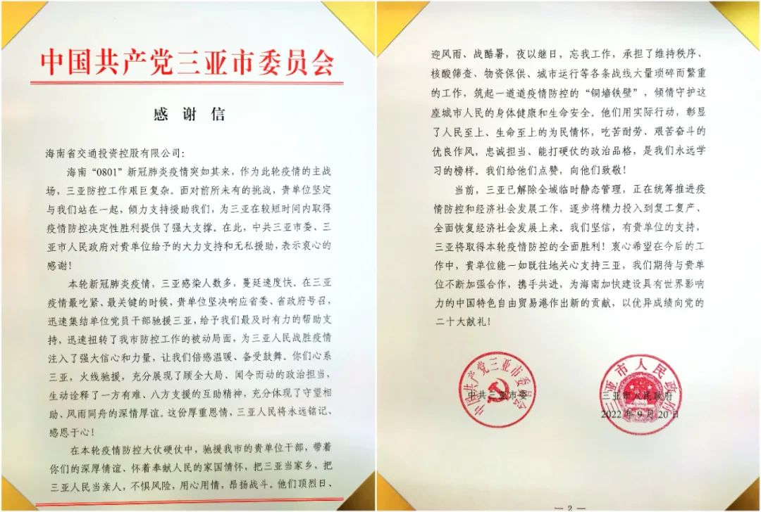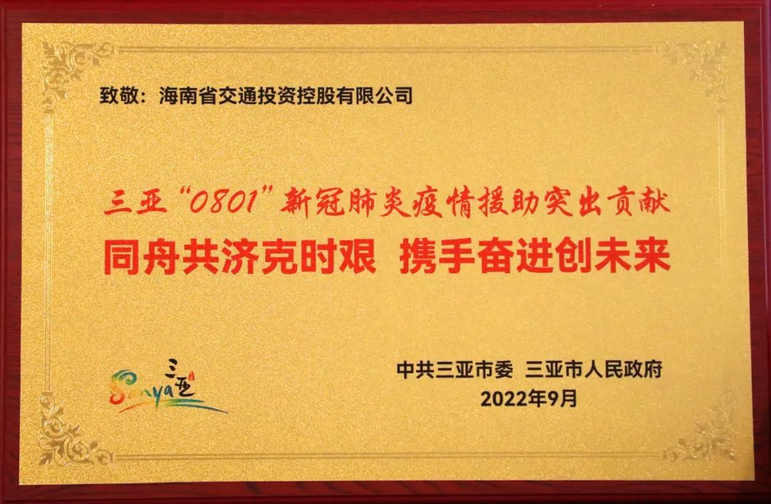 “同舟共济克时艰,携手奋进创未来。”近日,海南交控被三亚市委、市政府授予“三亚‘0801’新冠肺炎疫情援助突出贡献”荣誉称号,并收到三亚市委、市政府《同心抗疫,感恩有您》感谢信,感谢公司坚定与三亚站在一起,倾力支持援助三亚,“为三亚在较短时间内取得疫情防控决定性胜利提供了强大支撑”。