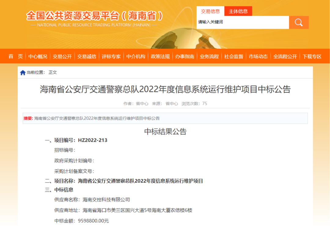 近日,经专家评审,海南交控科技有限公司(以下简称交控科技)中标海南省公安交通警察总队2022年度信息系统运行维护项目,中标金额959.88万元。该项目是交控科技中标的首个近千万元的交通领域信息化项目,对公司进一步拓展交通出行、安全监控等政府信息化项目建设领域的业务具有重要意义。