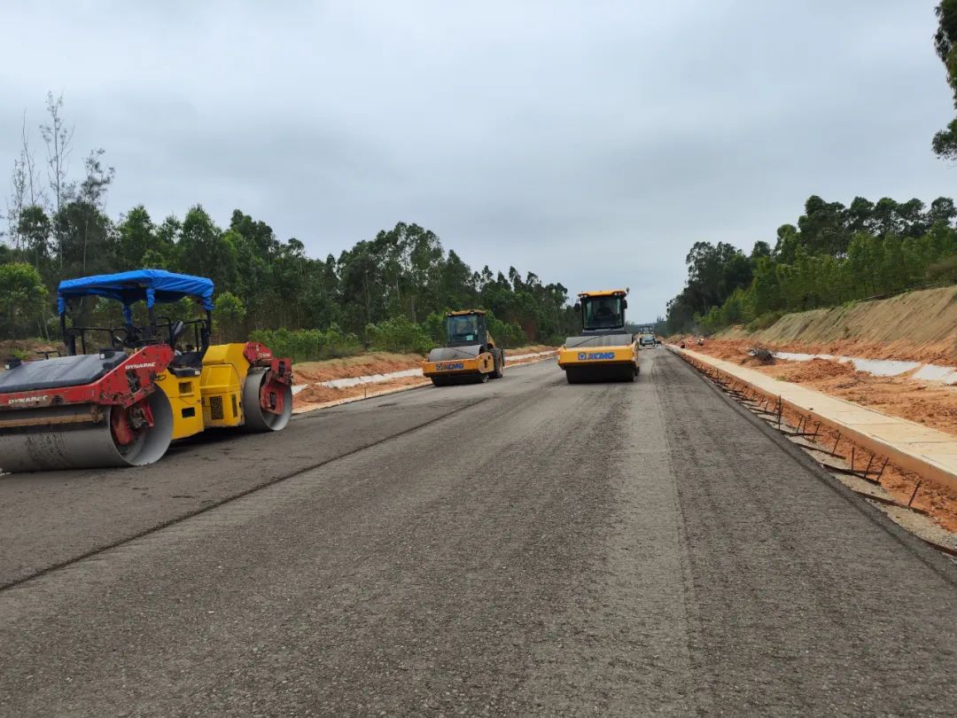 当天,环岛旅游公路项目五工区施工现场也是一派热火朝天的景象,摊铺机轰鸣不断、运输车来回穿梭、工人正在加紧施工,施工作业面繁忙而有序。