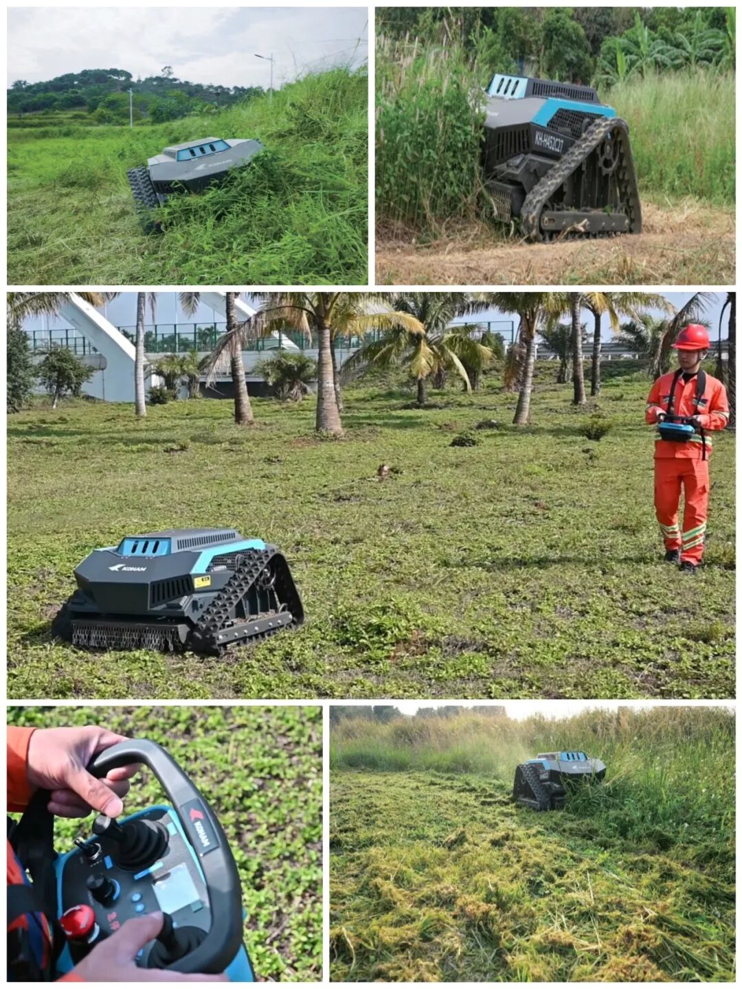 该设备搭载27英寸高强度甩刀,可高效切割各类杂草与细小灌木;油电混动系统兼顾了燃油动力的长续航与电驱系统的灵敏响应;宽幅履带底盘使其无惧泥泞、碎石,并能攀爬最大45度的坡道。同时,紧急停车、遥控启停、防飞溅挡链等多重安全设计,从源头上杜绝了作业风险,真正做到了“人不近险草自清”。