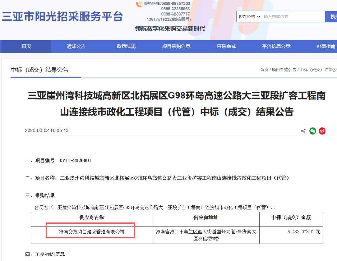 3月2日,海南交通集团下属单位海南交投项目建设管理有限公司成功中标三亚崖州湾科技城高新区北拓展区G98环岛高速公路大三亚段扩容工程南山连接线市政化工程项目(代管),中标金额6,483,073.00元。
