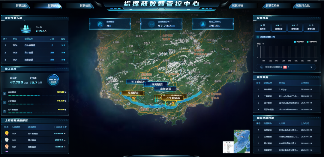 在隧道智慧化建设方面,紧扣人员、设备、环境、施工风险四大核心要素,配齐配强人员定位、视频监控、应急通话、有害气体监测、安全步距监测等全套智能系统。施工人员佩戴定位芯片安全帽,管理人员可实时掌握洞内人员分布、行动轨迹;硫化氢、甲烷、一氧化碳、氧气等有害气体浓度实时监测、云端上传;掌子面与初支、二衬安全步距自动预警,全方位筑牢隧道施工安全屏障。