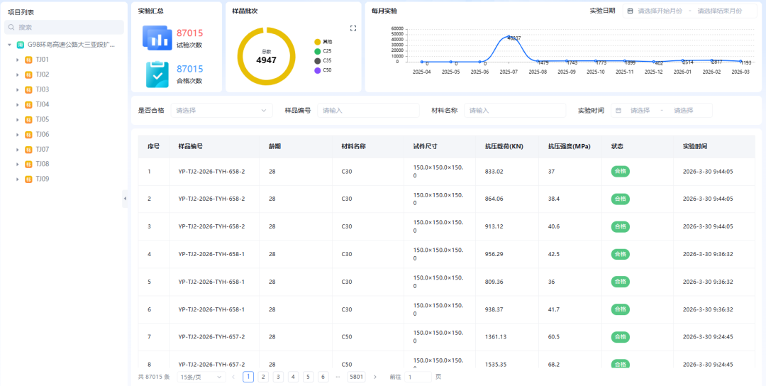 项目始终将试验检测作为工程质量管控的第一道防线,依托科技手段强化全过程检测监管,全力构建“数据自动采集、信息实时上传、全程溯源可查、施工留痕可溯”的现代化质量管理体系。