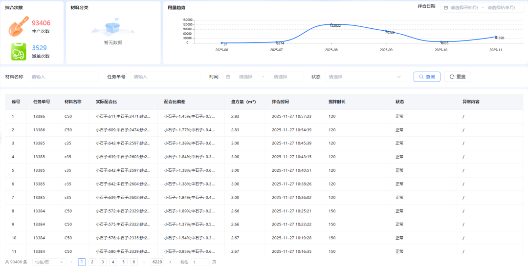 在数字拌合站建设方面,项目对拌和站同步部署视频监控系统、环境监测系统和生产监控系统,对原材料投入、生产配合比、出料数量等实施全过程实时监控,自动采集生产数据并形成统计报表,对不合格或异常参数自动预警,有效保障了混凝土质量稳定性。