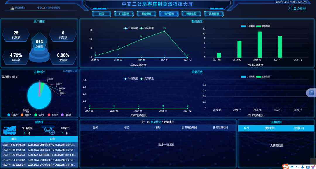 在可视化工地和智能感知监测方面,于钢筋加工场、预制梁场、拌和站、试验室、隧道进出口及重点控制性桥梁作业面,全覆盖布设高清监控设备与环境监测终端,实时采集分析扬尘、噪声、温湿度、气象等现场数据,全面提升施工现场可视化、智能化管控水平。通过智慧工地建设,项目质量安全管理实现从“人防为主”向“技防为主”、从“事后整改”向“事前预警”的跨越式升级。