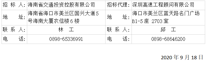 招标文件 第二章 投标人须知中投标人须知前附表第8.5.1款 “监督部门:海南省交通运输厅”修改为“监督部门:海南省交通投资控股有限公司纪检监察部”;“地 址:海口市海府大道49号省政府办公楼5楼” 修改为“地 址:海南省海口市国兴大道5号海南大厦农信楼6楼”;“电 话:0898-65220131”修改为“电 话:0898-65809621”;“传 真:”修改为“传 真:0898-65809621”;“邮政编码:570204”修改为“邮政编码:570203”。