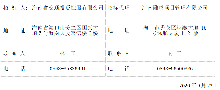 海南省交通投资控股有限公司委托海南融腾项目管理有限公司的海南省环岛旅游公路工程环境影响评价(不含昌江段和琼海段)技术服务招标于2020年9月14日在中国招标投标公共服务平台、全国公共资源交易平台(海南省)、海南省交通投资控股有限公司发布招标公告,本项目招标文件作如下补充说明,本补遗书与招标文件有不一致之处,以本补遗书为准。