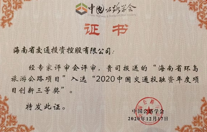 12月17日,由中国公路学会、河南交通投资集团有限公司共同举办的中国交通产业经济联席会议成立大会暨2020中国交通投融资年会在郑州召开,公布23个年度创新项目获奖名单及15篇年度优秀论文名单,其中,海南交控投资建设的海南省环岛旅游公路项目投融资模式获“2020中国交通投融资年度项目创新三等奖”。