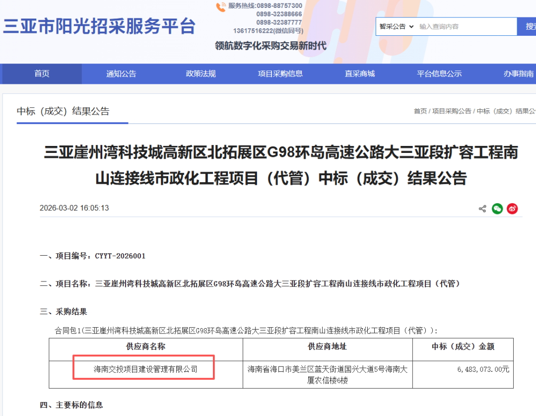 3月2日,海南交通集团下属单位海南交投项目建设管理有限公司成功中标三亚崖州湾科技城高新区北拓展区G98环岛高速公路大三亚段扩容工程南山连接线市政化工程项目(代管),中标金额6,483,073.00元。 [更多]