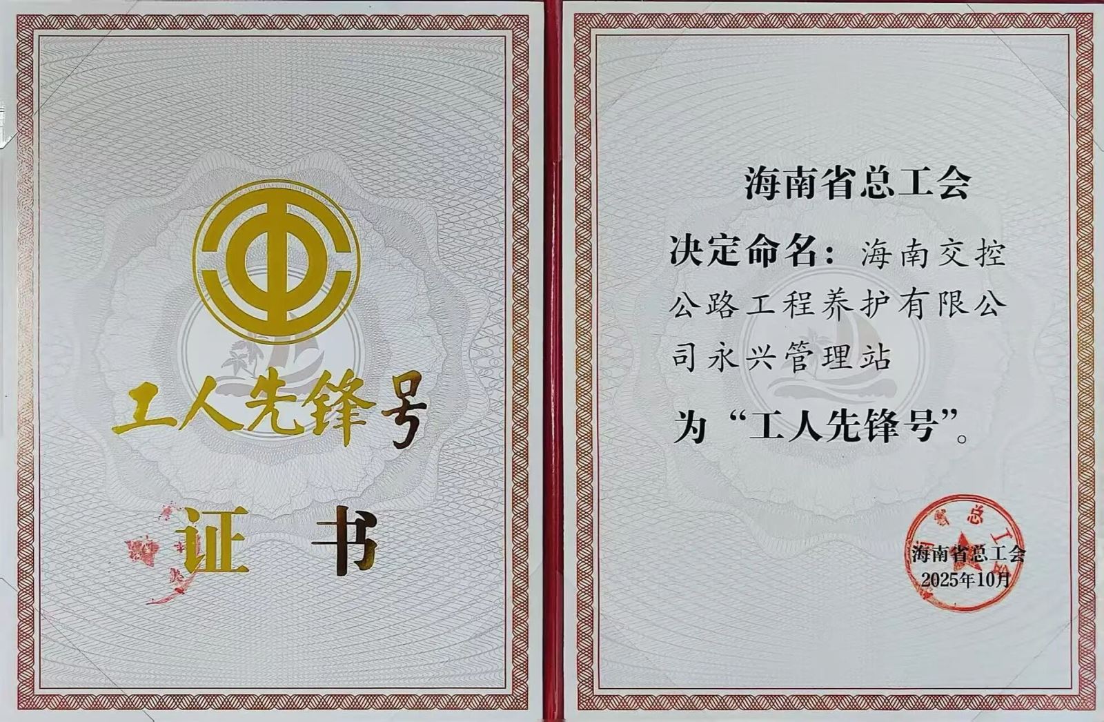 近日,海南交通集团旗下海南交投养护公司永兴管理站凭借卓越的专业素养、严谨的工作作风和突出的综合业绩,被海南省总工会授予“海南省工人先锋号”称号。此项殊荣既是对永兴管理站全体成员长期以来坚守一线、履职尽责、锐意进取的充分肯定,也是海南交投养护公司基层班组建设成果的集中体现。