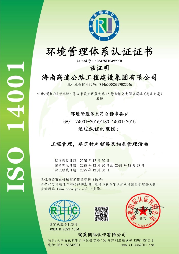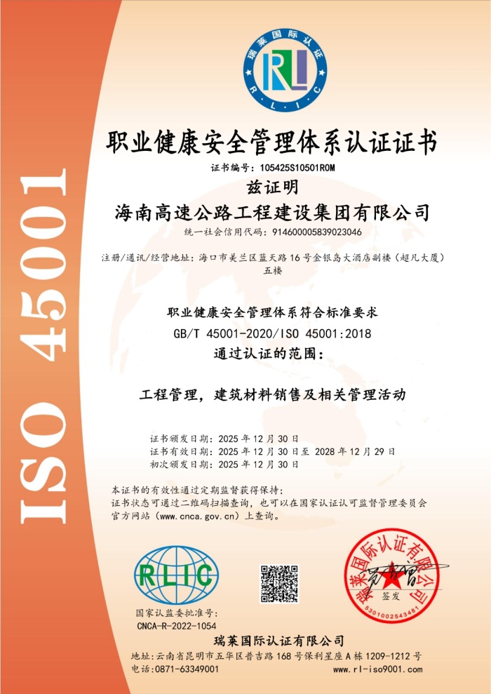 12月30日,海南高速公路股份有限公司下辖子公司海南高速公路工程建设集团有限公司(以下简称“建设集团”)顺利通过ISO9001质量管理体系、ISO14001环境管理体系及ISO45001职业健康安全管理体系认证,并获颁认证证书。这标志着公司在质量、环境与职业健康安全管理的规范化、标准化、国际化方面实现重要突破,为业务高质量发展与可持续运营奠定了坚实的体系基础。