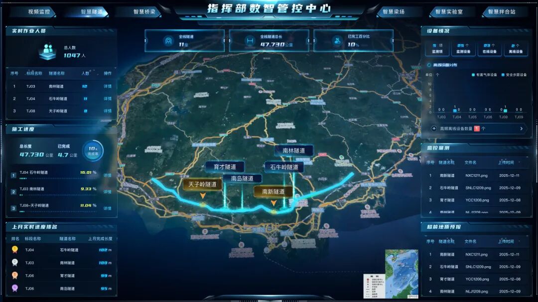 智慧工地模块:智慧隧道已实现10座具备工作面的隧道人员定位监测,数据更新频率≤3秒;智慧拌合站累计生成预警信息1.2万条以上,应急响应时间缩短至3分钟以内。