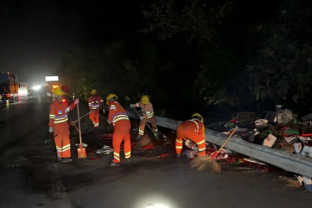 “快!防撞车后方值守,开启警示灯光,划定安全作业范围,严防二次事故发生!”安全员符致瑜当即指挥,防撞车稳稳地挡在事故区域后方,为抢险作业筑牢“安全防护墙”。在刺眼的车灯和闪烁的警灯下,养护人员争分夺秒地进行现场清理和协助扶正车辆。经过2个多小时的连续奋战,道路恢复畅通。此时,已是凌晨。