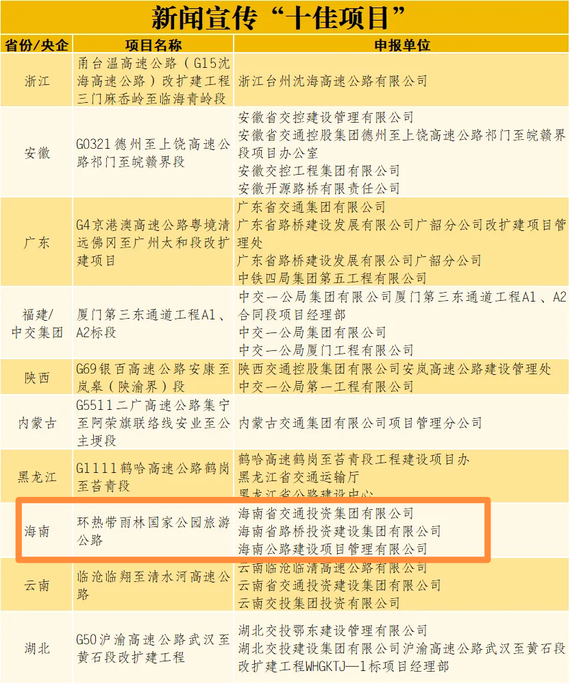 2月14日,《中国交通报》揭晓2025年公路重大工程新闻宣传“十佳项目”推选展示活动结果。经过项目申报、两次专家审核、展示公示等程序,由海南交通集团投资建设的环热带雨林国家公园旅游公路项目,从全国众多申报项目中脱颖而出,荣获2025年公路重大工程新闻宣传“十佳项目”,成为我省此次唯一获奖的工程项目。