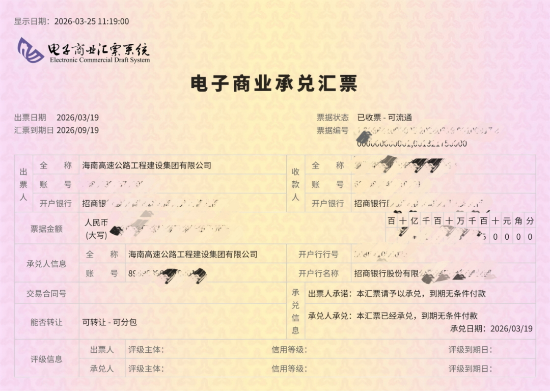 海南自贸港供应链票据平台”由海南交通集团旗下海南交控投资有限公司(以下简称“投资公司”)联合山东通汇资本投资集团有限公司打造,旨在引入供应链票据这种新型支付工具,赋能海南贸易供应链。2025年12月份完成系统建设并实现了首单开票,此次供应商低利率收票贴现,充分发挥了供应链票据线上化、可流转、低成本的特点。