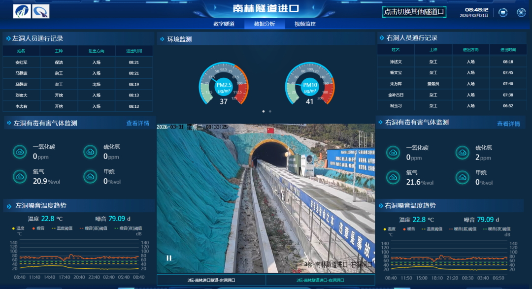 在隧道智慧化建设方面,紧扣人员、设备、环境、施工风险四大核心要素,配齐配强人员定位、视频监控、应急通话、有害气体监测、安全步距监测等全套智能系统。施工人员佩戴定位芯片安全帽,管理人员可实时掌握洞内人员分布、行动轨迹;硫化氢、甲烷、一氧化碳、氧气等有害气体浓度实时监测、云端上传;掌子面与初支、二衬安全步距自动预警,全方位筑牢隧道施工安全屏障。