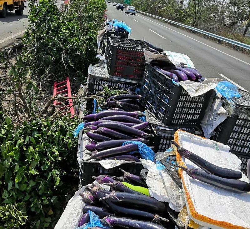 一辆满载冬季瓜菜运往内地的大型货车在东线高速三亚往海口方向K26+200中央隔离带发生侧翻