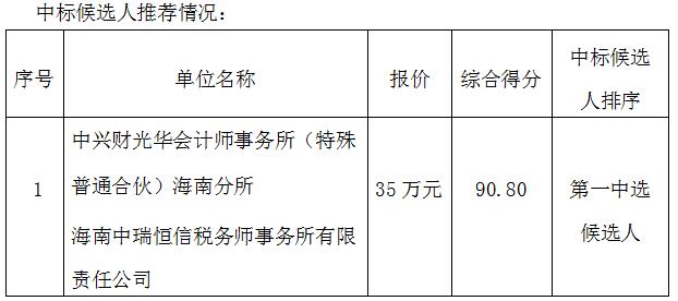 海南省交通投资控股有限公司2020年度财务报表审计及税务鉴证审计机构选聘项目已于2020年11月11日开标,现将评标结果予以公示,公示期为2020年11月16日至2020年11月20日。如对评标结果有异议,可依法进行投诉。
